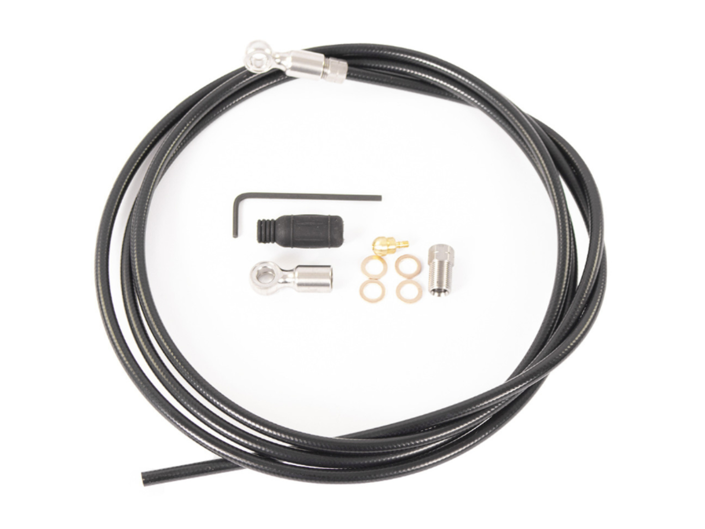 délka hadice 1800 mm včetně příslušenství: 2x banjo přípojka 2x kompresní matice 2x trn 4x distanční podložka pro třmen 6x9x1 mm 1x plastová čepička 1x imbusový klíč 2 mm hmotnost včetně balení: 88 g (váženo)
